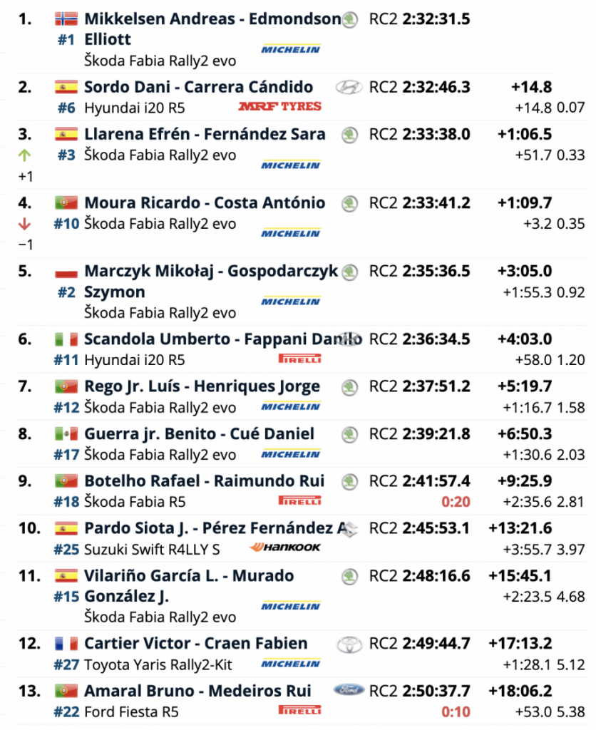 Efrén Llarena, el miembro mejor ubicado del ERC-Michelin Talent Factory, le arrebató el tercer lugar al héroe local Ricardo Moura cuando el 10 veces campeón de las Azores rodó y golpeó su neumático trasero izquierdo de su llanta en la etapa final con el último lugar en el podio en sus manos. «Cometí un error estúpido en una curva muy cerrada, recorté el interior y así son las cosas», dijo un abatido Moura, cuarto final que había liderado las primeras cinco etapas con una impresionante conducción en las traicioneras condiciones del viernes.