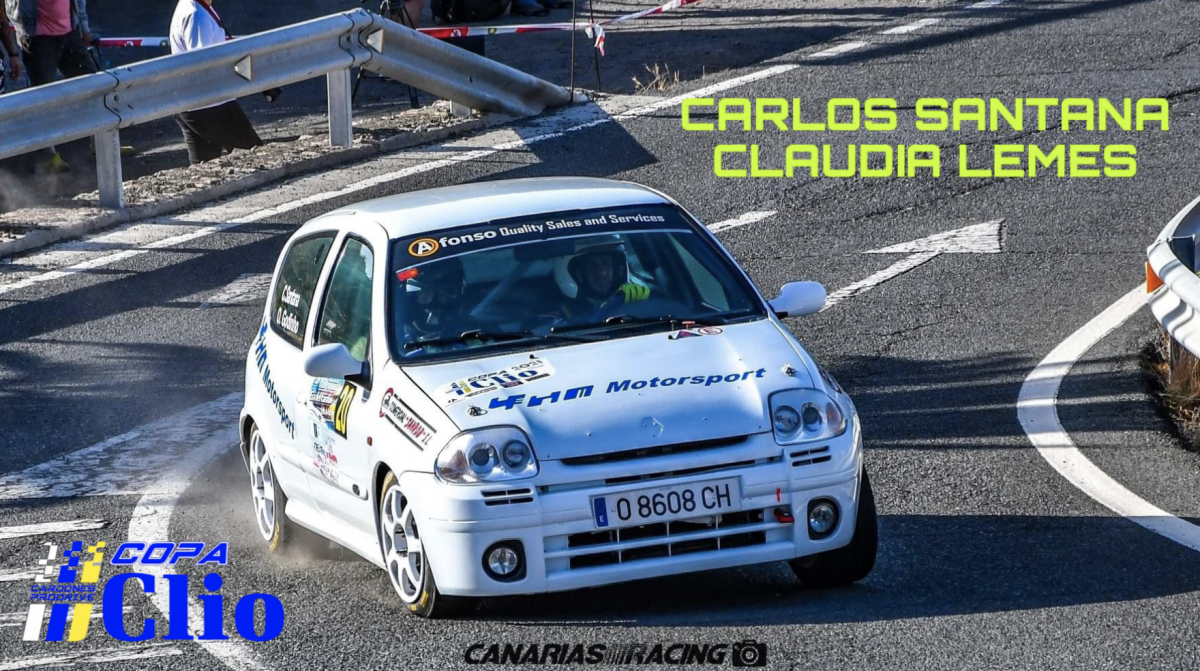 Dos incorporaciones: Carlos Santana, piloto contrastado; a su derecha, con la libreta, la joven copiloto Claudia Lemes a bordo del Renault Clio Sport. Con igual montura, desde la isla vecina, se suman Ayoze Suárez y Sevenzuí Luis, que no quieren perderse esta fiesta del automovilismo.