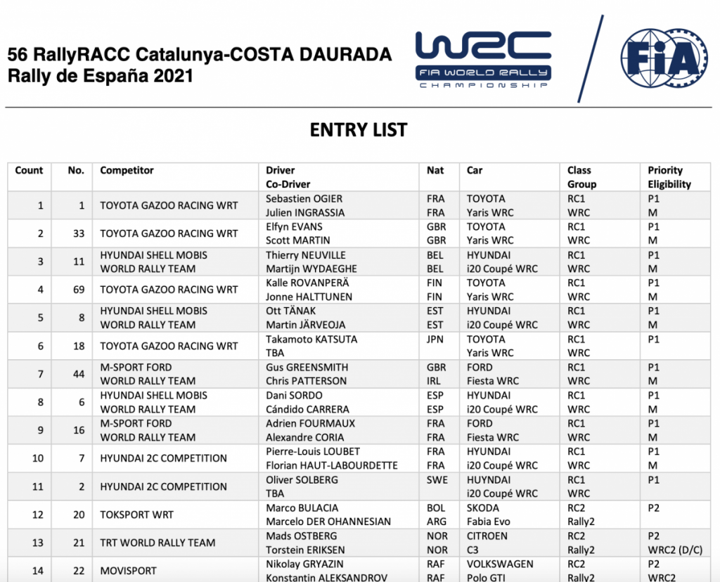 Publicamos la lista de inscritos del 56 RallyRACC Cataluña, cita del Campeonato del Mundo de Rallys (WRC).