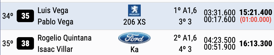 Cuartos son Surhayen Pernía y Alba Sánchez (Hyundai i20 Rally2), que están a 23.8 de la cabeza, a 12.6 del último escalón del podio y superando en 12.3 a Oscar Palacio y Enrique Velasco (Ford Fiesta MkII Rally2), quintos.