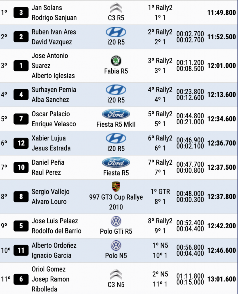 Se podría decir que casi de manera sorpresiva el catalán ha logrado ser primero en el tramo inicial, segundo en el siguiente y cuartos en el tercero y último del primer día para irse a la cama con una ventaja de 2.7 sobre los gallegos Iván Ares y David Vázquez (Hyundai i20 Rally2), que fueron los más rápidos en la segunda especial y segundos en la primera y tercera especial, por lo que la renta con los líderes no es importante y en los siete tramos del sábado todo puede pasar.