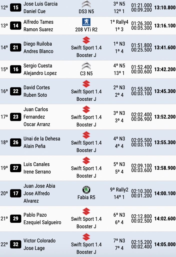 Los equipos compuestos por José Luis Peláez – Rodolfo del Barrio (Volkswagen Polo GTi Rally2) y Alberto Ordoñez – Ignacio García (Volkswagen Polo N5) cierran las diez primeras posiciones.