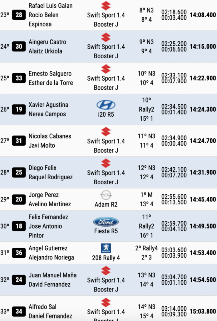 Cuartos son Surhayen Pernía y Alba Sánchez (Hyundai i20 Rally2), que están a 23.8 de la cabeza, a 12.6 del último escalón del podio y superando en 12.3 a Oscar Palacio y Enrique Velasco (Ford Fiesta MkII Rally2), quintos.