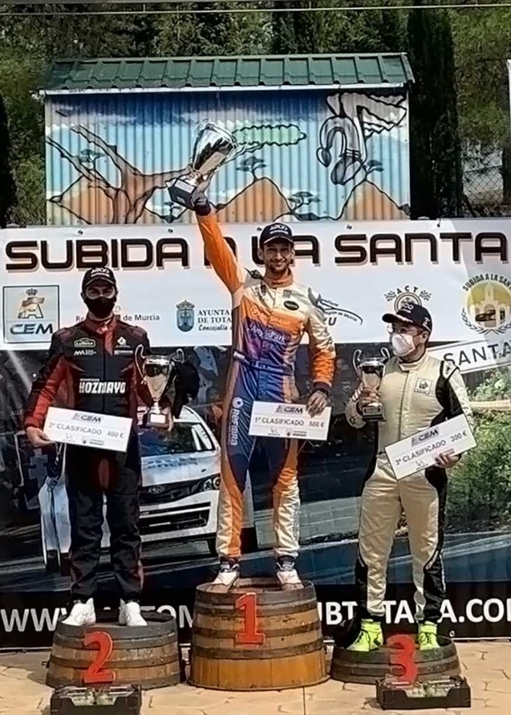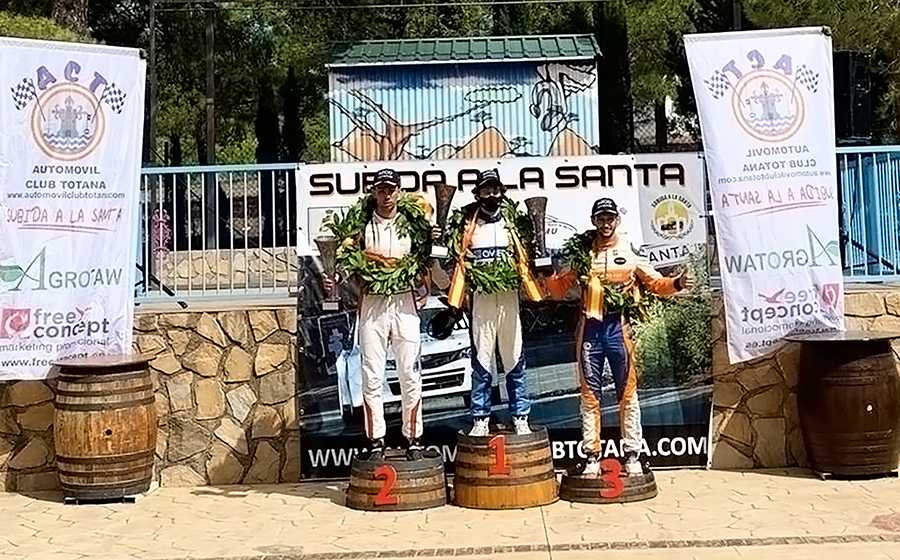 -Los pilotos del ACA Esport flanquean a Javi Villa en el podio absoluto de la subida de la región murciana.