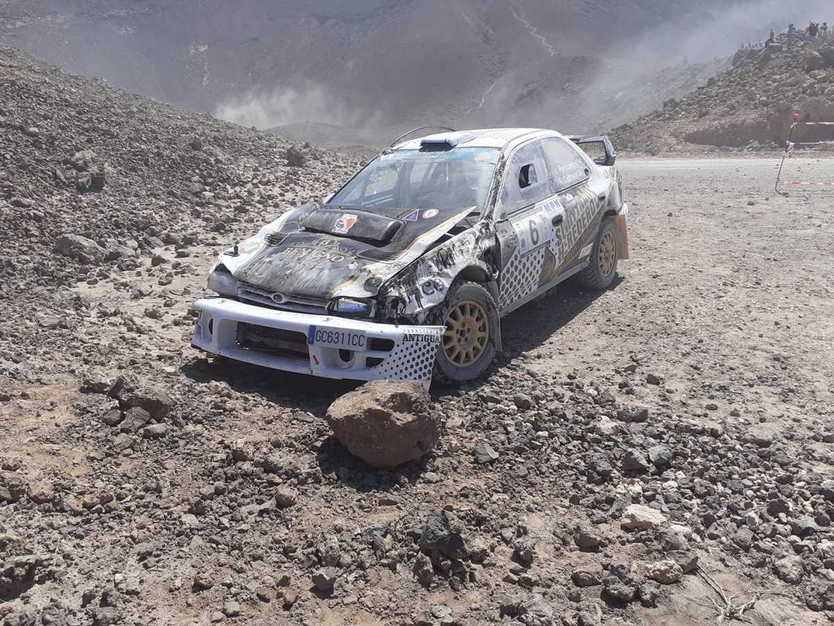 Los majoreros Iriome Perdomo y Francisco Cabrera solo pudieron terminar la primera manga del Slalom La Piconera al volcar el Subaru Impreza STI con el que competían