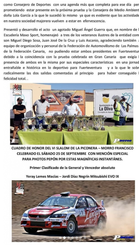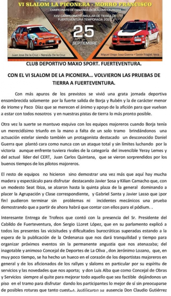 La majorera escudería Maxo Sport resume el Slalom de La Piconera, cita del Campeonato de Canarias de Slaloms celebrado el pasado sábado en la isla de Fuerteventura.