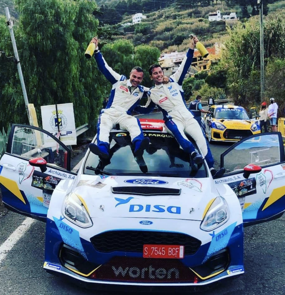 El copiloto grancanario Yeray Mujica es un hombre feliz, porque a la derecha del tinerfeño Enrique Cruz en el Ford Fiesta Rally2 del equipo Copi Sport va de victoria en victoria, como la lograda en el pasado Rally Villa de Teror.
