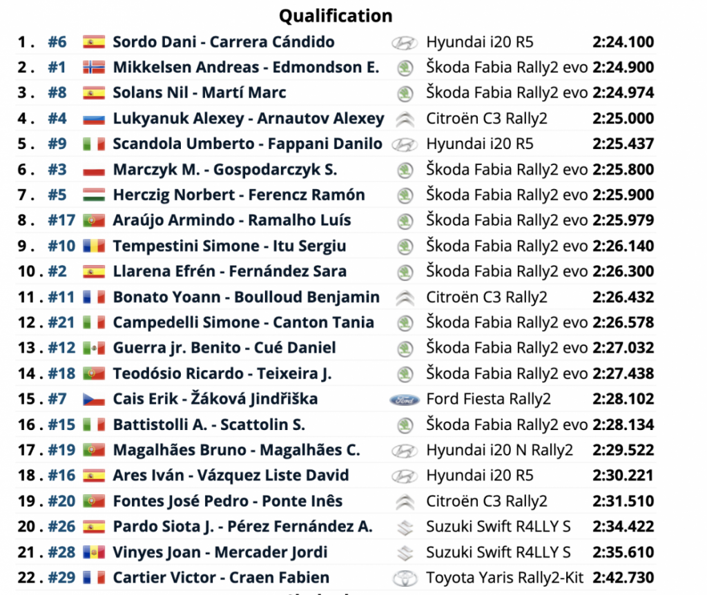 Conduciendo un Hyundai i20 R5 para el Team MRF Tires, Sordo venció a Andreas Mikkelsen, pilotando el Škoda Fabia Rally2 Evo del Toksport WRT, por 0,8 segundos en la especial de Monte, de 3,25 kilómetros.