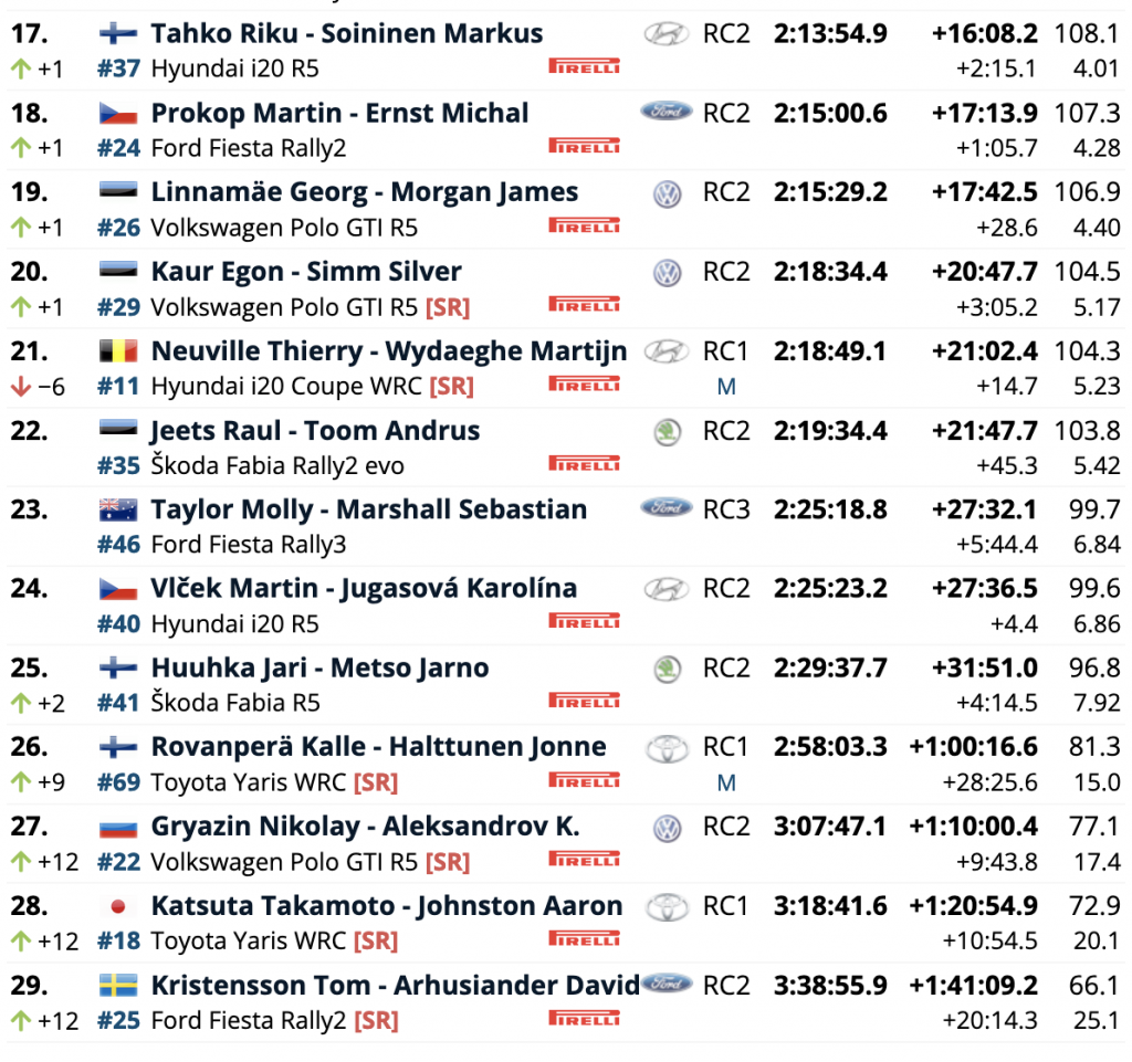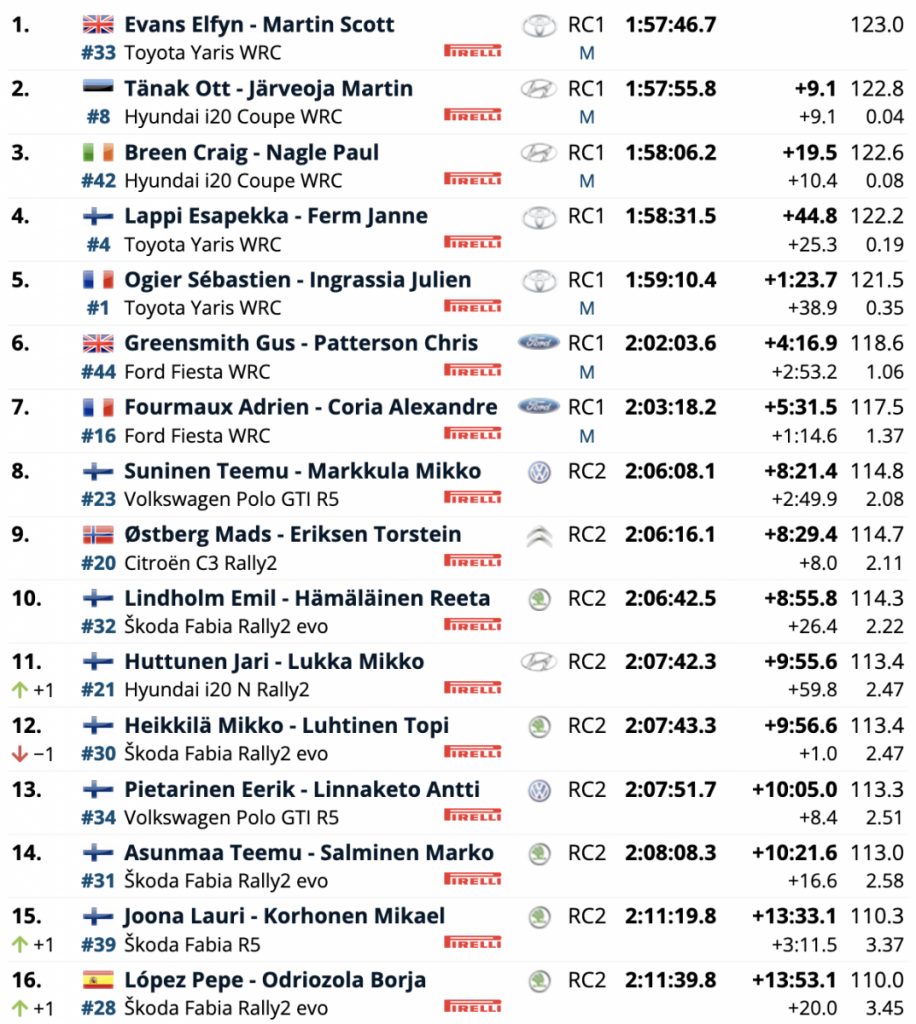 El dúo de Ford Fiesta Gus Greensmith y Adrien Fourmaux fueron sexto y séptimo, con el líder del WRC2 Teemu Suninen octavo en un Volkswagen Polo GTI. Mads Østberg y el líder del WRC3, Emil Lindholm, completaron la tabla de posiciones.