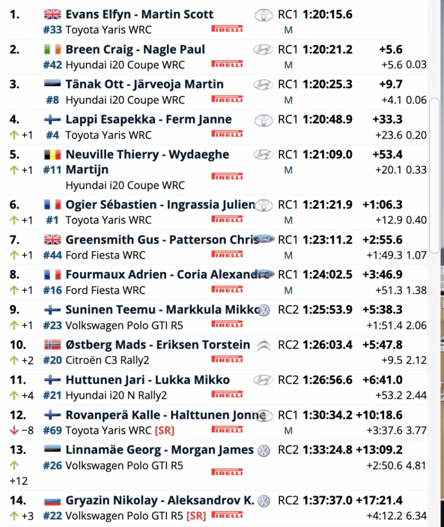 Los irlandeses Craig Breen y Paul Nagle (Hyundai i20 Coupe WRC) partían esta mañana como líderes, con 2.8 sobre sus compañeros de equipo, los estonios Ott Tänak y Martin Järveoja (Hyundai i20 Coupe WRC), pero ambos se han encontrado con unos muy fuertes Evans y Martin, que han ganado las cuatro especiales de la mañana de la cita finesa, no dejando lugar a dudas de su gran mañana, pasando de estar a 6.1 de Breen y Nagle a superarles ahora en 5.6, mientras que Tänak y Järveoja son terceros a 9.7 del liderato y a 4.1 del segundo lugar.