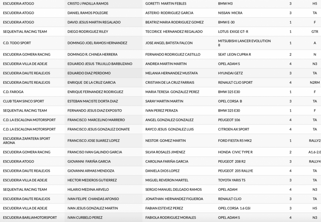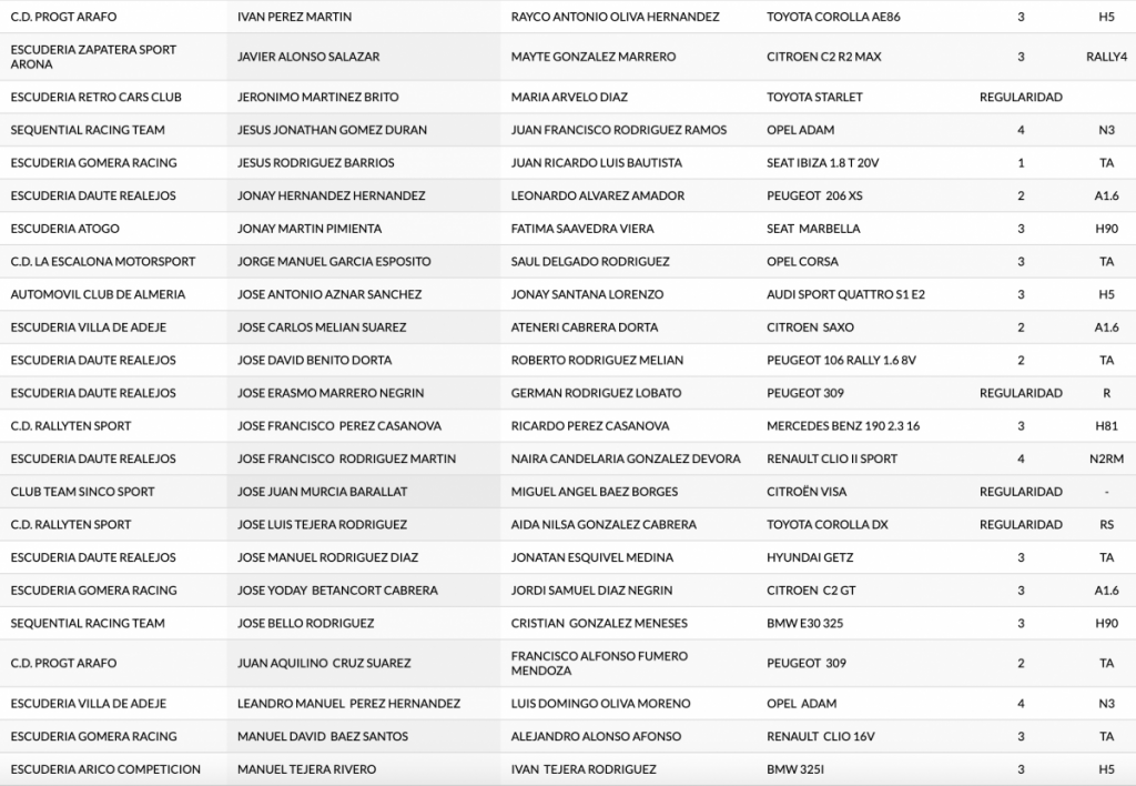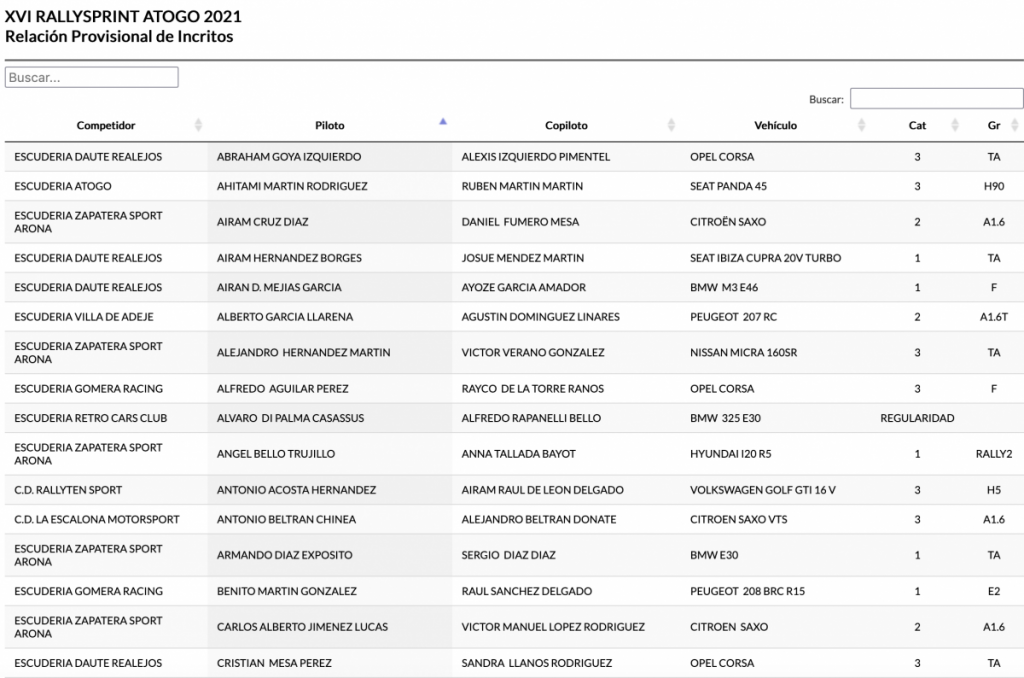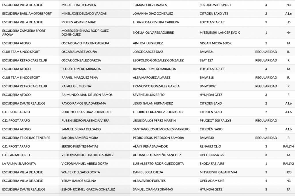 Publicamos la relación de inscritos del XVI Rallysprint de Atogo, evento que se celebrará en la isla de Tenertife este próximo sábado y cuyo recorrido será: ‘Atogo Norte’ (6,38 km a las 8:30 h, 10:25 h y 12:20 h) y ‘Atogo Sur’ (6,51 km a las 14:55 h, 16:50 h y 18:45 h). En total, los participantes afrontarán 38,67 kilómetros contra el crono.