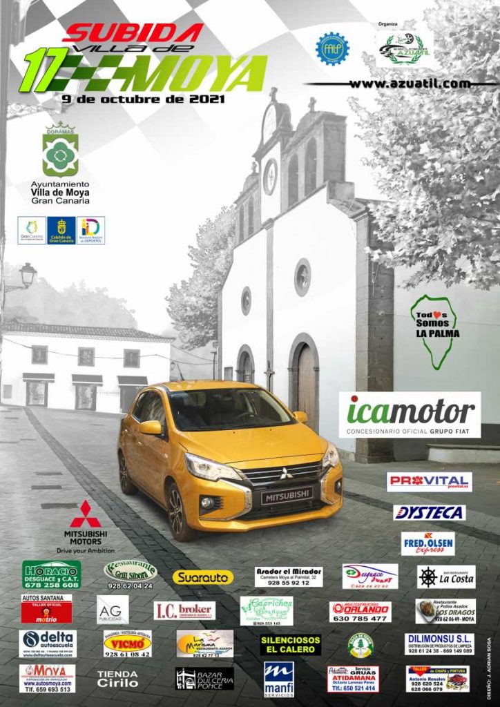 Anoche se presentó oficialmente la 17º Subida Villa de Moya, que de la mano del CD. Azuatil se disputará este sábado en el trazado original de 7,012 km entre el cruce de La Fragata y Jardín de Corvo, después de los recortes del pasado año para cumplir los protocolos anti-covid. La actividad se iniciará el viernes por la tarde en el casco de Moya con las verificaciones y continuará el sábado con las tres mangas de la subida y el final en Fontanales, con la entrega de trofeos. Precisamente la iglesia antigua de este pueblo y el nuevo Mitsubishi Space Star son los motivos que han inspirado el cartel de esta edición de la prueba, en un nuevo acertado diseño de Adrián Sosa, miembro del club organizador.