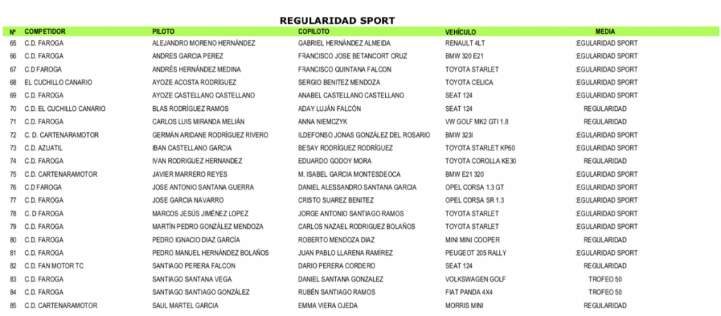 En la lista ofrecida por orden alfabético tenemos como claros aspirantes a las plazas de honor a los «gallos» de la Montaña, como Iván Armas y Julio Martínez con sendos Porsche 911 GT3, los Mitsubishi Lancer Evo´s de Gustavo Bolaños y Miguel Angel Cabral; el SEAT León de Juany Jorge o el Peugeot 208 R2 de Nelson Climent, entre otros. En monoplazas, José Luis Rodríguez y René Santana con sus Silver Cars, más Bentejuí Rodríguez con la radical barqueta Norma M20F. En total son 48 pilotos inscritos en velocidad, con una importante presencia de nada menos que siete unidades de «soplillos» (R-5 GT Turbo), que casi podrían formar una copa monomarca. Y fiel a su cita no fallan tampoco Miguel Quintino con su espectacular M3 o Domingo Pulido con el Skoda Fabia RS del equipo Sin Barreras Driving.