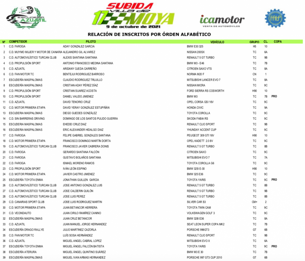 Con el cartel, se anunció también en la presentación, la alta cifra de inscritos alcanzada esta temporada 2021, con unos 85 equipos entre las tres modalidades: Velocidad, Regularidad Sport y Fórmula Rally. Y es que una vez más esta rampa de montaña tiene algo «mágico» para muchos pilotos que nunca se la quieren perder, a pesar de ser la subida con menos desnivel de todas las del Campeonato de Montaña de las Palmas y se asemeja más a un tramo de rallye, sobre todo si las condiciones son de asfalto mojado que es algo bastante habitual ya en esta época del año. De ahí quizá su atractivo especial y que forma parte de un evento de referencia para el municipio de Moya y su acertado eslógan de «Moya, de costa a cumbre: Un lugar mágico para el deporte».