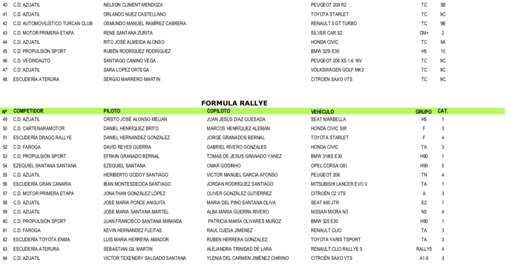 En la lista ofrecida por orden alfabético tenemos como claros aspirantes a las plazas de honor a los «gallos» de la Montaña, como Iván Armas y Julio Martínez con sendos Porsche 911 GT3, los Mitsubishi Lancer Evo´s de Gustavo Bolaños y Miguel Angel Cabral; el SEAT León de Juany Jorge o el Peugeot 208 R2 de Nelson Climent, entre otros. En monoplazas, José Luis Rodríguez y René Santana con sus Silver Cars, más Bentejuí Rodríguez con la radical barqueta Norma M20F. En total son 48 pilotos inscritos en velocidad, con una importante presencia de nada menos que siete unidades de «soplillos» (R-5 GT Turbo), que casi podrían formar una copa monomarca. Y fiel a su cita no fallan tampoco Miguel Quintino con su espectacular M3 o Domingo Pulido con el Skoda Fabia RS del equipo Sin Barreras Driving.