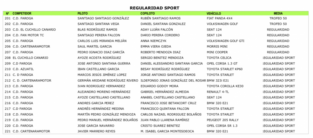 En la modalidad Fórmula Rally son 15 equipos, con la importante presencia de José María Ponce con el SEAT 600 JTR, copilotado por María del Pino Santana, ganadora de una promoción realizada por el piloto en sus redes sociales. Otro que se suma es Heriberto Godoy, desempolvando su Peugeot 206 RC. O Juanfra Santana con su BMW 325i. Y éxito participativo también en Regularidad Sport, con 21 equipos que no se han querido perder esta tradicional rampa montañera, con la mayoría optando por la atrevida media alta en esta subida, cinco en media baja y dos del Trofeo 50.