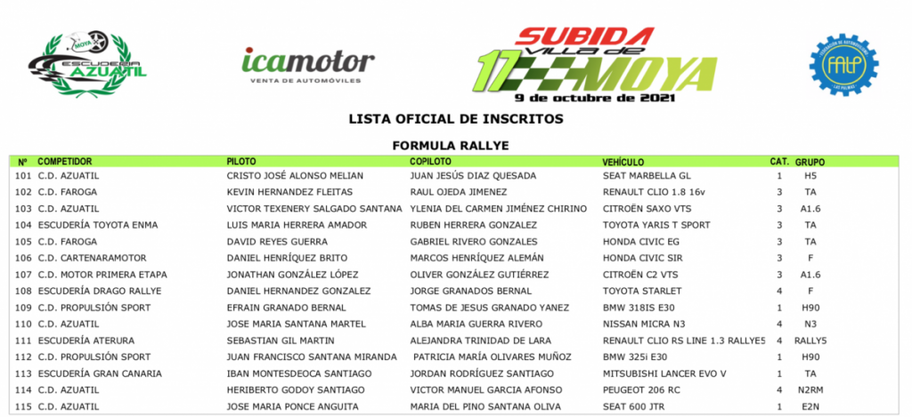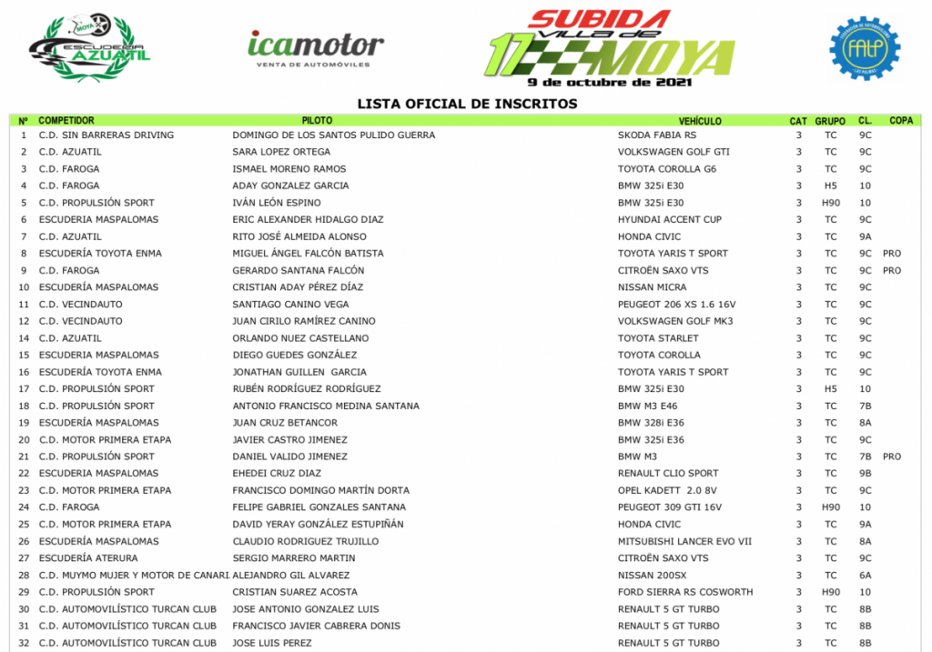 La 17º Subida Villa de Moya contará finalmente con un total de 84 participantes, que se dividen en 48 pilotos en Velocidad, 15 equipos en Fórmula Rally y 21 equipos más en Regularidad Sport. La prueba se disputa este sábado a partir de las 10 de la mañana, con verificaciones el viernes por la tarde en el casco urbano de Moya y la entrega de trofeos en Fontanales, sobre las 14 horas.