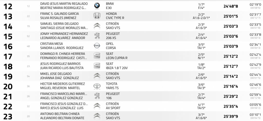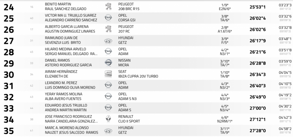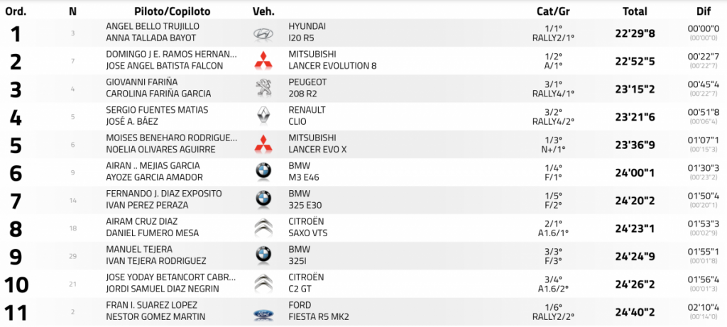 Segundos fueron los grancanarios Domingo Joel Ramos y José Ángel Batista (Mitsubishi Lancer Evo VIII) en su segunda carrera del año tras el triunfo en el Rallysprint de La Era del Cardón, quedándose a 22.7 de la cabeza y superando en 22.7 a los terceros clasificados, Giovanni Fariña y Carolina Fariña, que vuelven a sacarle todo y más a su pequeño y ratonero Peugeot 208 R2 para ocupar el último escalón del podio.
