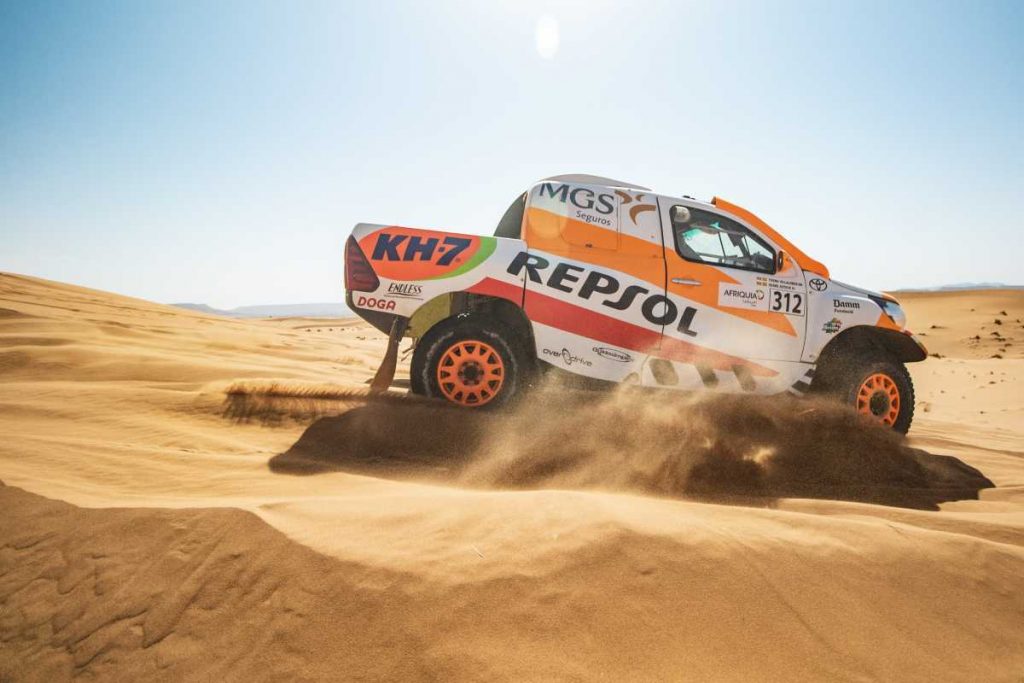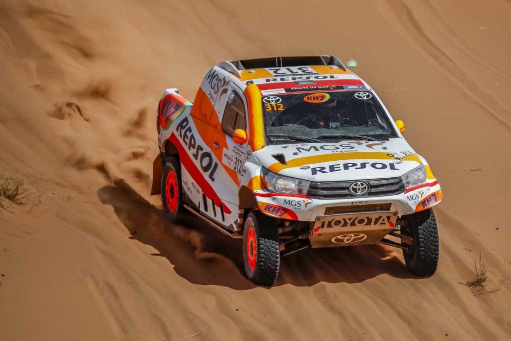 «Hoy hemos salido muy rápido y bien, pero en una zona de dunas el coche se ha quedado plantado en una cresta. Txema no ha tenido que llegar a bajarse porque hacia atrás y hacia delante hemos podido bordearla y salir de ahí. Pero la especial era muy corta y todo el mundo salía a tope. Nos ha alcanzado en ese momento Yacopini y al ver que faltaban 60 km para el final, hemos decidido ir a ritmo, sin arriesgar nada. Pero acabamos el rally súper contentos«, desgrana su último día en Marruecos el piloto apoyado por Repsol, MGS Seguros, KH-7 y Toyota España.