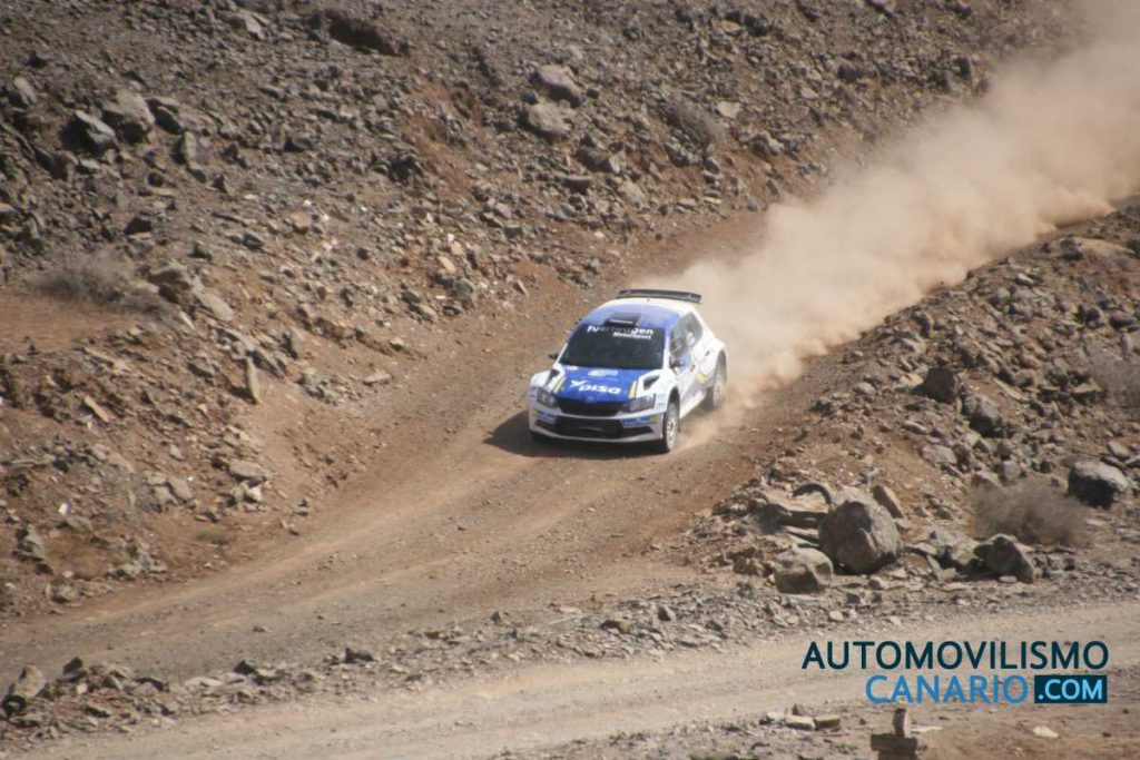 La segunda posición final ha sido para Gustavo Sosa-Ariday Bonilla (Skoda Fabia R5), que se mantuvieron en la segunda plaza a lo largo de casi toda la prueba, hasta que decidieron apretar en los dos tramos finales, reduciendo la ventaja de Tacoronte a sólo 1,3 segundos a falta de dos tramos. Lo dieron todo y se lanzaron a tope, pero con la mala suerte de cometer el único fallo de la jornada al pinchar en la rueda trasera derecha en el TC7, lo que impidió su posible scratch. Tacoronte no estaba ajeno al empuje de su rival y no se lo puso nada fácil: También imprimía más brío a su pilotaje y se hacía con el mejor crono del TC6 y cedían solamente 0,4 segundos en el último TC, cosechando la segunda victoria consecutiva en el rallye de tierra grancanario.