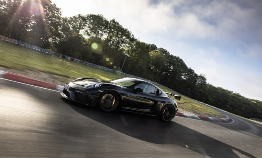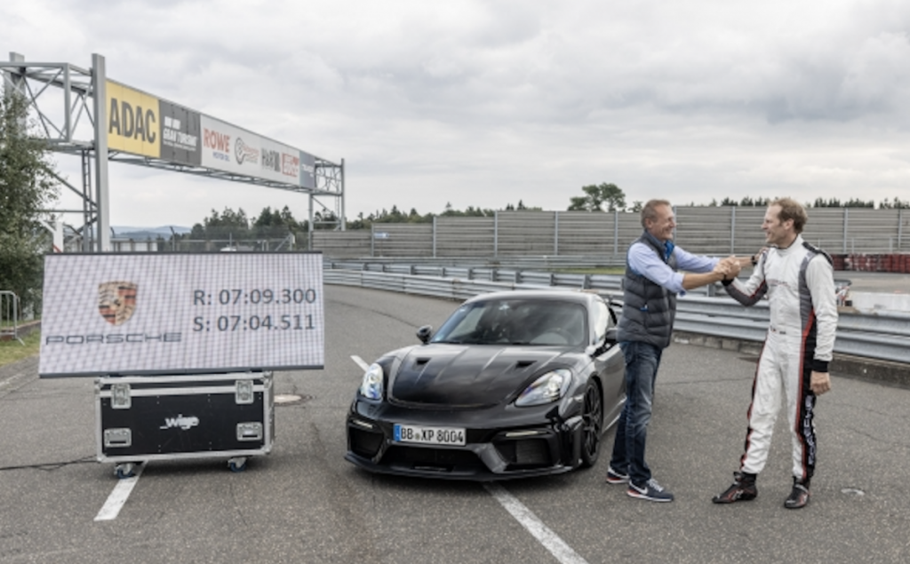 El embajador de Porsche y piloto de desarrollo Jörg Bergmeister ha recorrido los 20,832 kilómetros de la legendaria pista de Nürburgring-Nordschleife en 7 minutos y 9,300 segundos, una marca impresionante para un vehículo de producción. El 718 Cayman GT4 RS completó la variante corta de este trazado, que con 20,6 kilómetros servía previamente como referencia para el establecimiento de récords, en 7:04.511 minutos, lo que supone rodar 23,6 segundos más rápido que su hermano menor el 718 Cayman GT4. Para proteger al piloto, este deportivo con motor central estaba equipado con un asiento de competición. Además, montaba los neumáticos Michelin Pilot Sport Cup 2 R que se ofrecerán como opción. Un notario dio fe del peso del coche y sus especificaciones de serie.