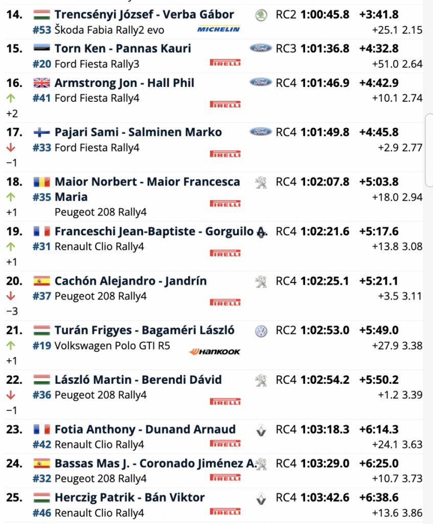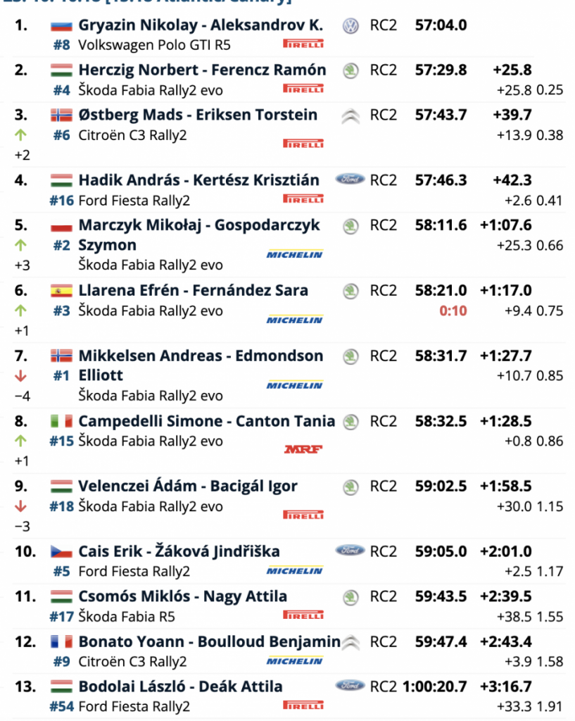 Aparte de un mal momento en el TC4, ha sido un día sin mayores problemas para Gryazin, quien está haciendo su debut en el Rally de Hungría y está en la contienda por logeae la segunda victoria en el ERC esta temporada. «Debemos continuar trabajando porque es fácil pinchar», dijo Gryazin. “Sin conocer las etapas es muy difícil porque no sabes si habrá cortes y es muy difícil acercarse a los laterales de las carreteras estrechas. Si empujas demasiado, es muy fácil salir por fuera de la curva y romper algo. No es necesario que vayas al ritmo más rápido, pero debes ser constante».