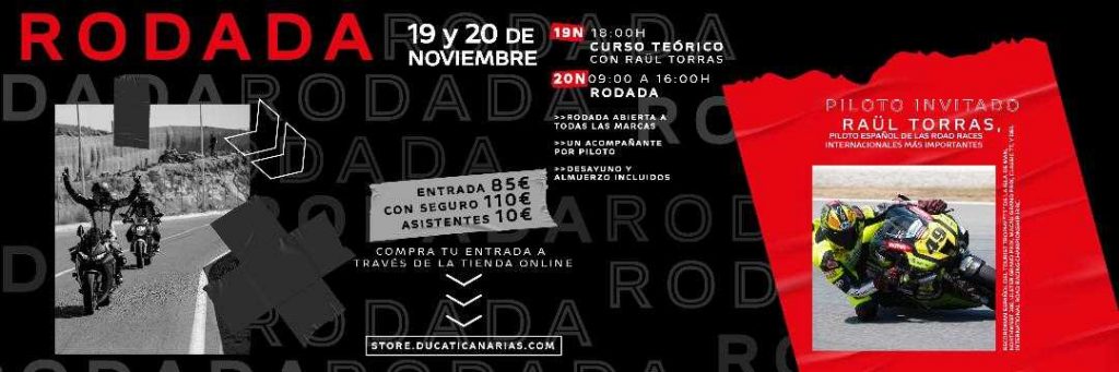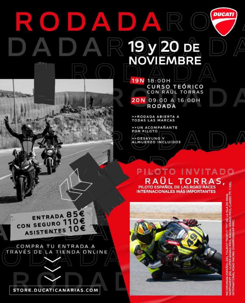 El próximo 20 de noviembre está marcado en el calendario de los amantes de las motos, ya que Ducati Canarias quiere volver a reunir a los apasionados de las dos ruedas en su tradicional rodada. La cita será en el Circuito de Maspalomas, esta dará comienzo a las 9 de la mañana y durará hasta las 16 horas, más tiempo que el pasado año para disfrutar del asfalto. Y no sólo ampliamos las horas de rodada, sino que además te traemos en primicia al gran piloto invitado: Raül Torras, piloto español de las Road Races internacionales más importantes. Recordman español del Tourist Trophy “TT” de la Isla de Man, NorthWest 200, Ulster Grand Prix, Macau Grand Prix, Classic TT, y del International Road Racing Championship IRRC.