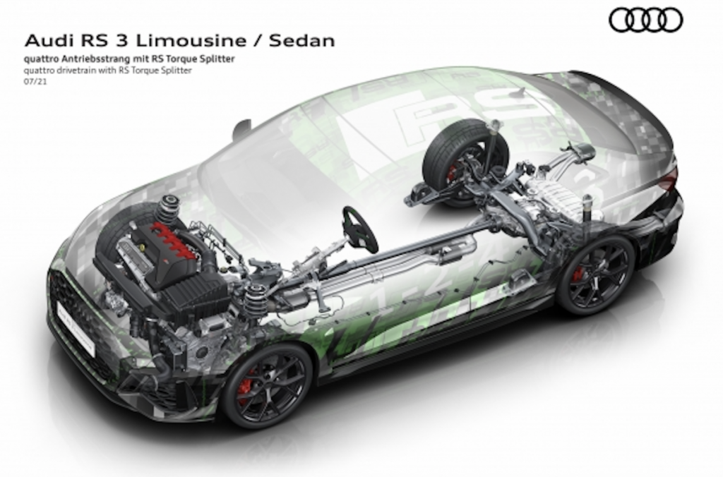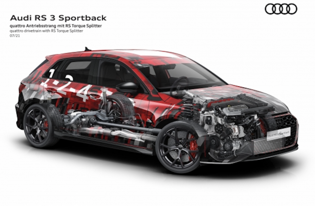 El nuevo RS 3 es el primer Audi equipado de serie con el sistema torque splitter (divisor de par), prorporcionando un comportamiento dinámico más equilibrado y una experiencia de conducción más emocionante. Sustituye en el eje trasero al diferencial con embrague multidisco. En su lugar, en cada uno de los semiejes de transmisión hay un embrague multidisco controlado electrónicamente para distribuir el par motor en el eje trasero de forma completamente variable. Durante una conducción más dinámica, aumenta el par de la rueda trasera exterior, sujeta a una carga mayor, lo que reduce significativamente la tendencia al subviraje. Es decir, en las curvas a la izquierda, transmite más par motor a la rueda trasera derecha; en las curvas a la derecha, a la trasera izquierda. En línea recta lo reparte entre las dos ruedas. La diferencia generada en las fuerzas de propulsión permiten al nuevo RS 3 seguir con mayor precisión la trayectoria indicada desde el volante, especialmente en curvas tomadas a alta velocidad.