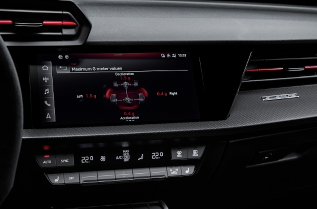 El aviso de cambio de marcha específico RS en el modo de cambio manual va modificando la visualización de las revoluciones de color verde a amarillo y a rojo, parpadeando de forma idéntica a la utilizada en competición para indicar el momento ideal para cambiar de marcha. Esta funcionalidad también se integra en el head-up display opcional, disponible por primera vez para el RS 3, que proyecta información relevante sobre el parabrisas dentro del campo visual directo del conductor. La pantalla táctil de 26 cm (10,1 pulgadas) en el salpicadero también incluye información sobre las temperaturas del refrigerante, del lubricante del motor y de la transmisión, así como fuerzas g y, opcionalmente, la presión de los neumáticos.