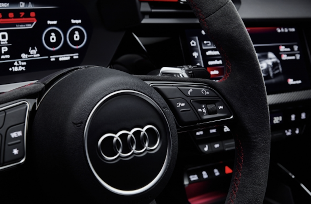 El RS 3 está equipado de serie con un volante deportivo multifunción RS de tres radios con la parte inferior achatada y forrado en cuero. Cuenta con levas de cambio de alta calidad fabricadas con zinc fundido a presión. El paquete de diseño RS añade, además del distintivo RS, una banda en la posición de las 12 horas para indicar más rápidamente la posición del volante cuando se conduce de forma deportiva. Como alternativa está disponible un volante RS redondo sin coste con reconocimiento de agarre capacitivo para las funciones de asistencia a la dirección. Con el paquete de estilo RS design opcional, el volante está tapizado en Alcantara y cuenta con costuras de contraste en color rojo o verde. Ambos volantes incorporan el nuevo botón RS Mode en el radio derecho, que permite alternar entre los modos RS Performance, RS Individual o el último modo utilizado del Audi drive select.
