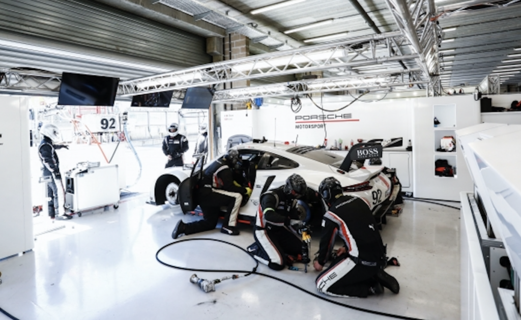 Los talleres del equipo de operaciones Manthey están casi vacíos desde el 6 de septiembre. Ese día, DHL, socio logístico del WEC, recogió cinco contenedores de doce metros de largo cada uno y los envió a Baréin desde la ciudad portuaria belga de Amberes. Estos contenedores están cargados con el material para las dos carreras en el país insular, incluidos los dos Porsche 911 RSR y los dos coches de seguridad, también mantenidos por Manthey. El equipo solo necesita más equipamiento que este para el plato fuerte de la temporada, las 24 Horas de Le Mans. A vuelo de pájaro, Le Mans, en Francia, está a solo 556 kilómetros, mientras que Baréin es un viaje de 4.558 kilómetros. Sin embargo, el proceso del transporte sigue siendo sorprendentemente fácil de gestionar.