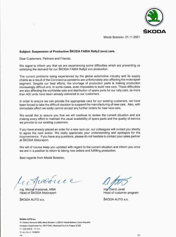 Michal Hrabánek, jefe del equipo Škoda Motorsport, y el director del programa de clientes, David Jareš, han comunicado la paralización de la producción de su unidad Fabia Rally2 evo, su unidad más exitosa.