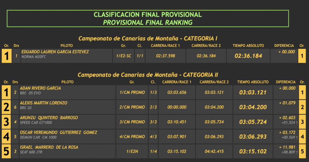 La subida, que se celebró en la carretera: TF-342 Los Realejos-Icod con un recorrido de 5.110 metros, vio como Lauren, a una velocidad media de 113 kilómetros por hora, batía el récord de la cita entre las barquetas, establecido en 2019 por Javier Afonso González (Silver Car S-3) con un 2:50:639, parando el reloj en 2:42.411 en la manga de entrenamientos. En la primera oficial iría aún a más con un 2:37.598, por un aún mejor 2:36.184 final, para lograr rebajar en más de 14 segundos, ¡una barbaridad!