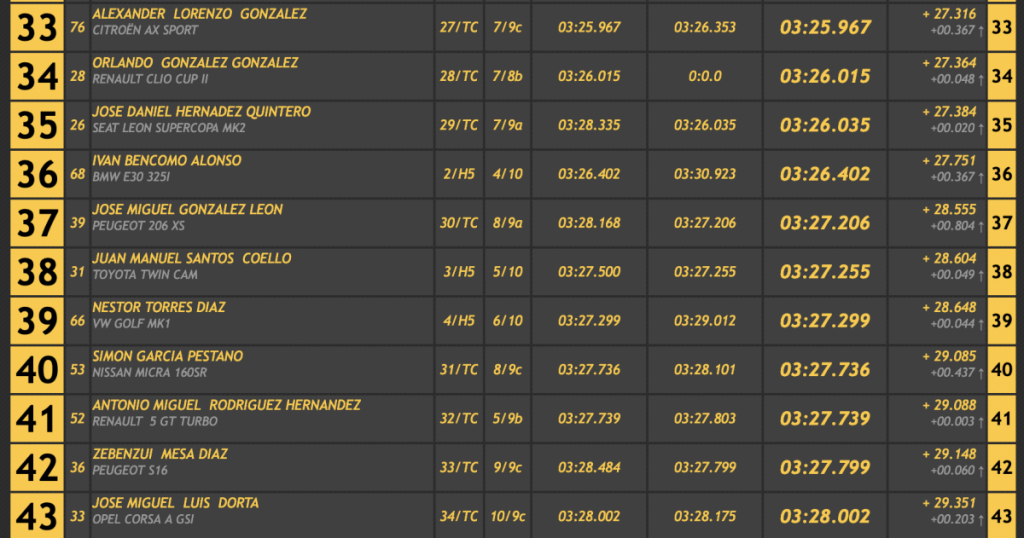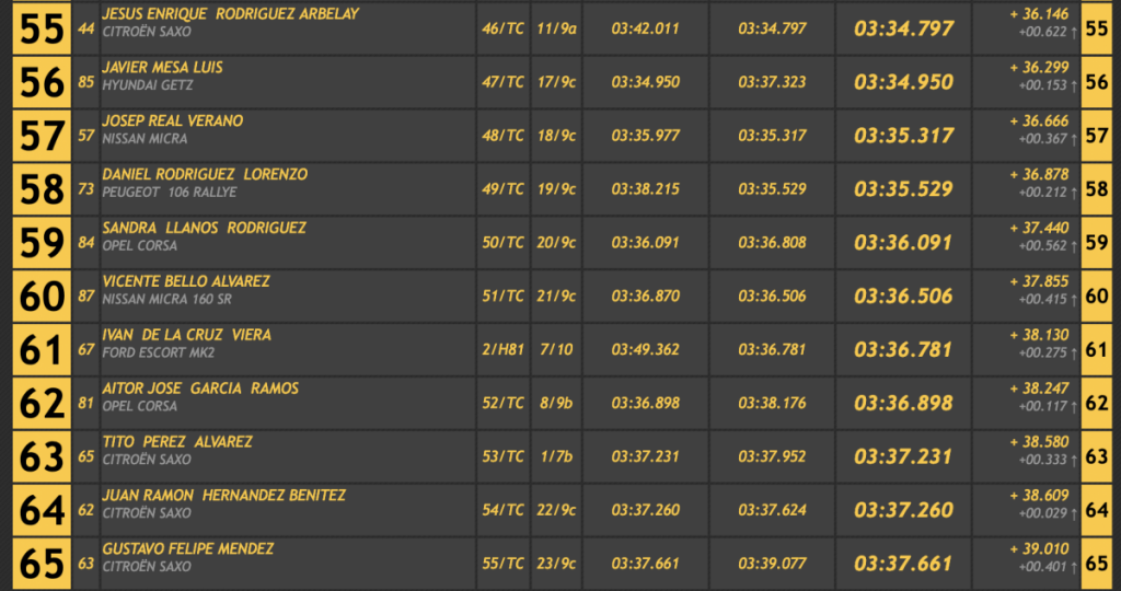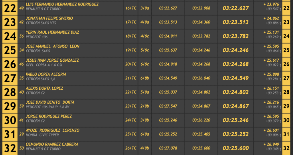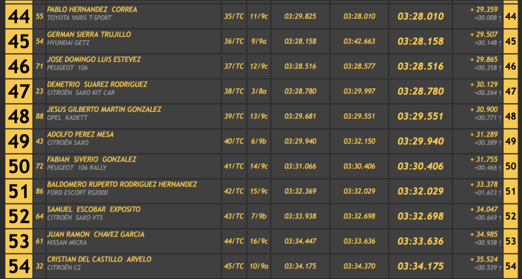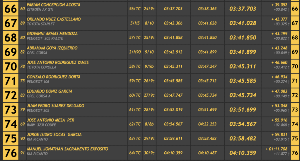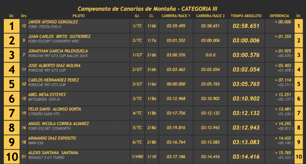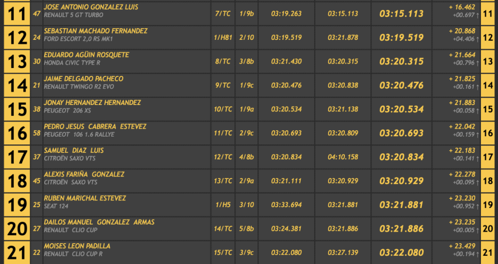 El octavo lugar fue a manos del veterano Ángel Nicolás Correa (Ford Escort Cosworth), seguido del siempre espectacular Armando Díaz (BMW E36), cerrando las diez primeras plazas el grancanario Alexis Santana (Renault 5 GT Turbo), primero entre los ‘soplillos’.