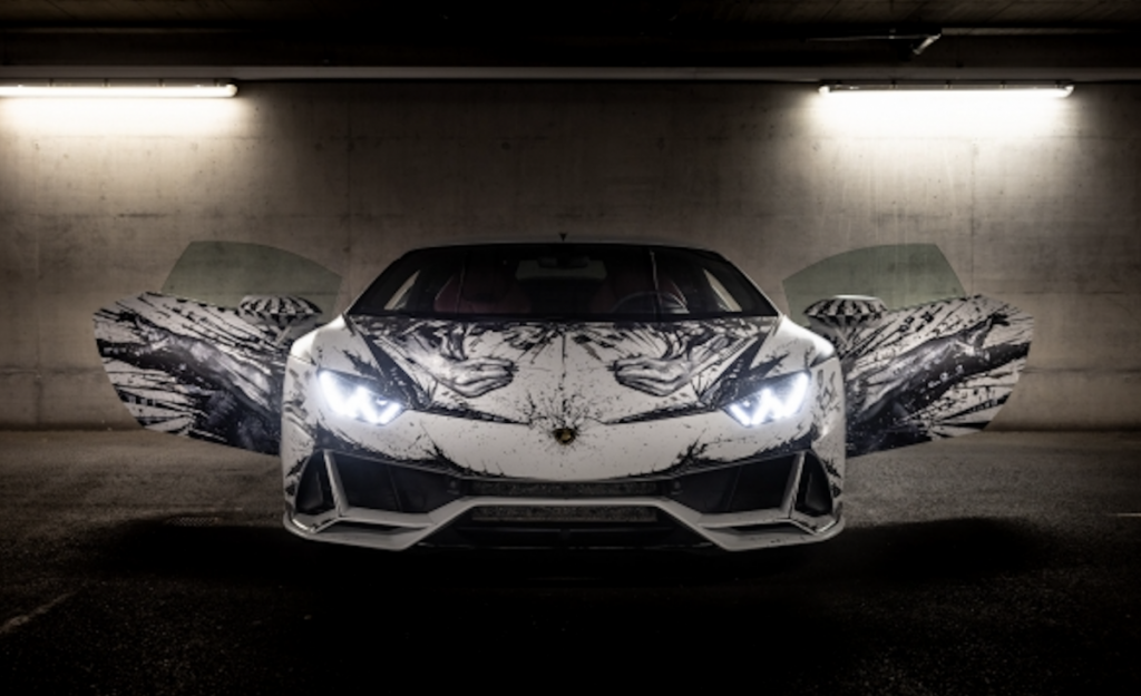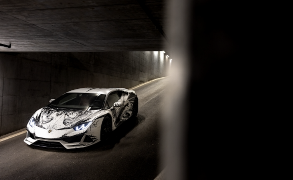 El artista rinde homenaje al Huracán EVO representando una fusión entre el hombre, el símbolo del toro de Automobili Lamborghini, y el concepto de mito expresado en la fuerza indomable – sobrenatural y casi animal – que desprende la figura del hombre pintada en los laterales del coche. La fuerza que transmiten los antebrazos y los puños cerrados en el capó delantero recuerdan a los cuernos de un toro.