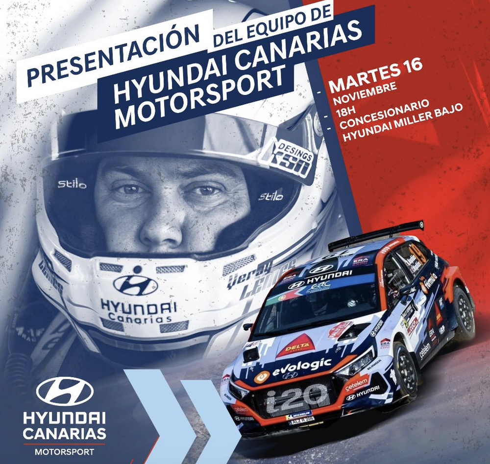Regresa el equipo de Hyundai Canarias Motorsport, que este próximo martes, día 16 de noviembre, se presentará a las 18.00h en las instalaciones de Hyundai Canarias en Miller Bajo, en la Calle Diego Vega Sarmiento, 11, Las Palmas de Gran Canaria, donde se desvelará en primicia el nuevo Hyundai i20N Rally2 con el que competirá el piloto Yeray Lemes, junto a Rogelio Peñate, en el espectáculo del motor más esperado por los aficionados canarios: en el 45º Rally Islas Canarias.