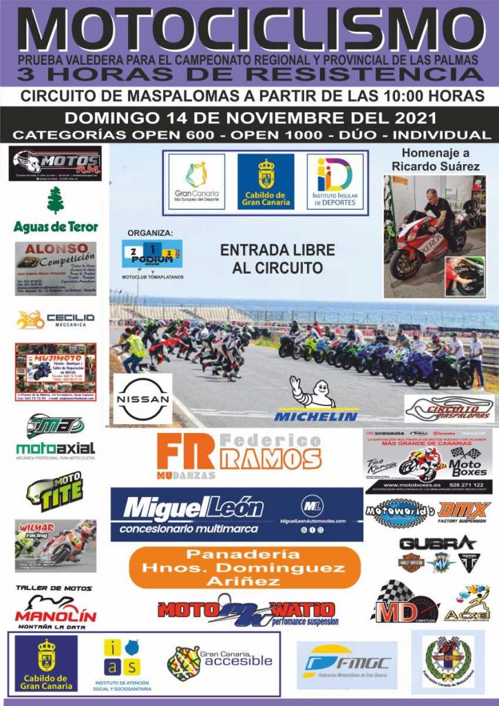Desde el Motoclub Podium se están puliendo todos los detalles para acoger como se merece una cita tan esperada por todos. Se esperan alrededor de 15 pilotos que vendrán de toda Canarias y será una carrera puntuable para el Campeonato de Canarias de Velocidad en todas sus categorías. Junto a la Federación de Motociclismo, el Motoclub Podium y todos los pilotos hacen una llamada a todos aquellos que tienen ganas de disfrutar de una jorna da inolvidable, el ambiente será festivo y la emoción está asegurada.