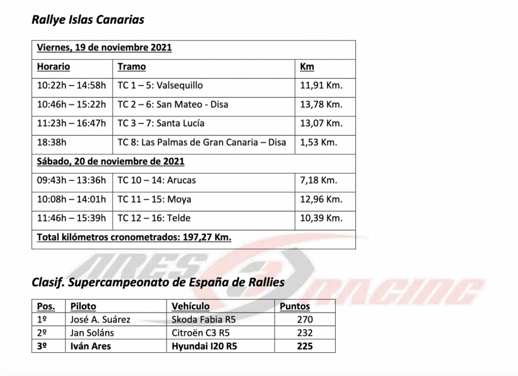 El Supercampeonato de España de Rallies, junto con el FIA European Rallye Championship, viaja el próximo fin de semana hasta Las Palmas de Gran Canaria para la disputa de una de las citas con más renombre de todo el calendario nacional. En territorio insular, la dupla gallega, formada por el piloto de Carral, Iván Ares, y el estradense, David Vázquez, intentarán brillar frente a los mejores equipos del certamen continental, a la vez que pelearán por repetir la victoria entre los equipos nacionales y mejorar la tercera plaza conseguida en el FIA European Rallye Championship la pasada temporada.