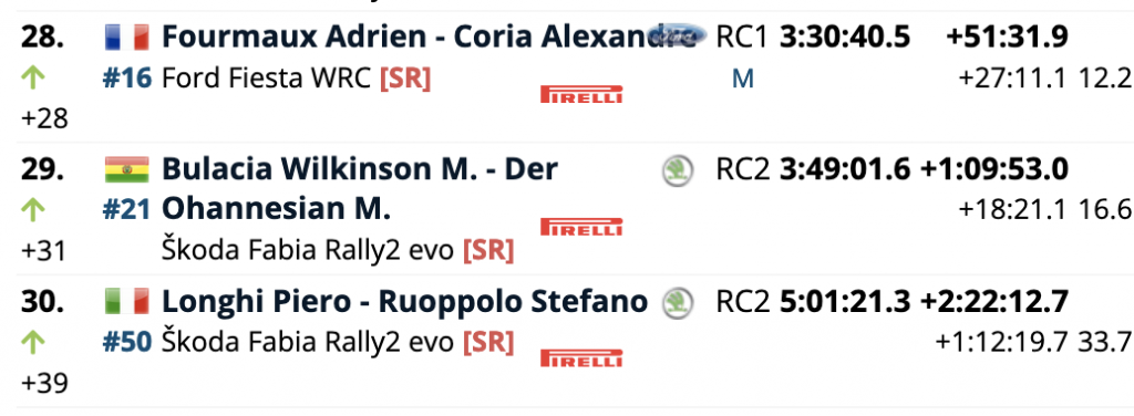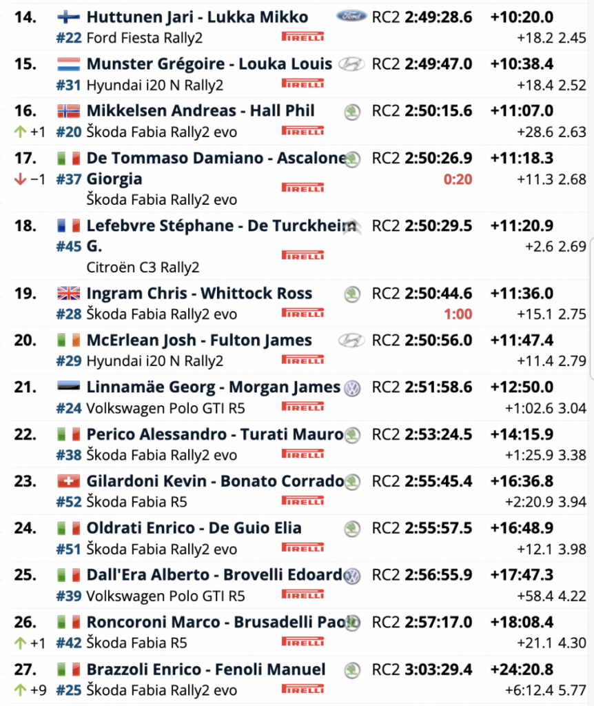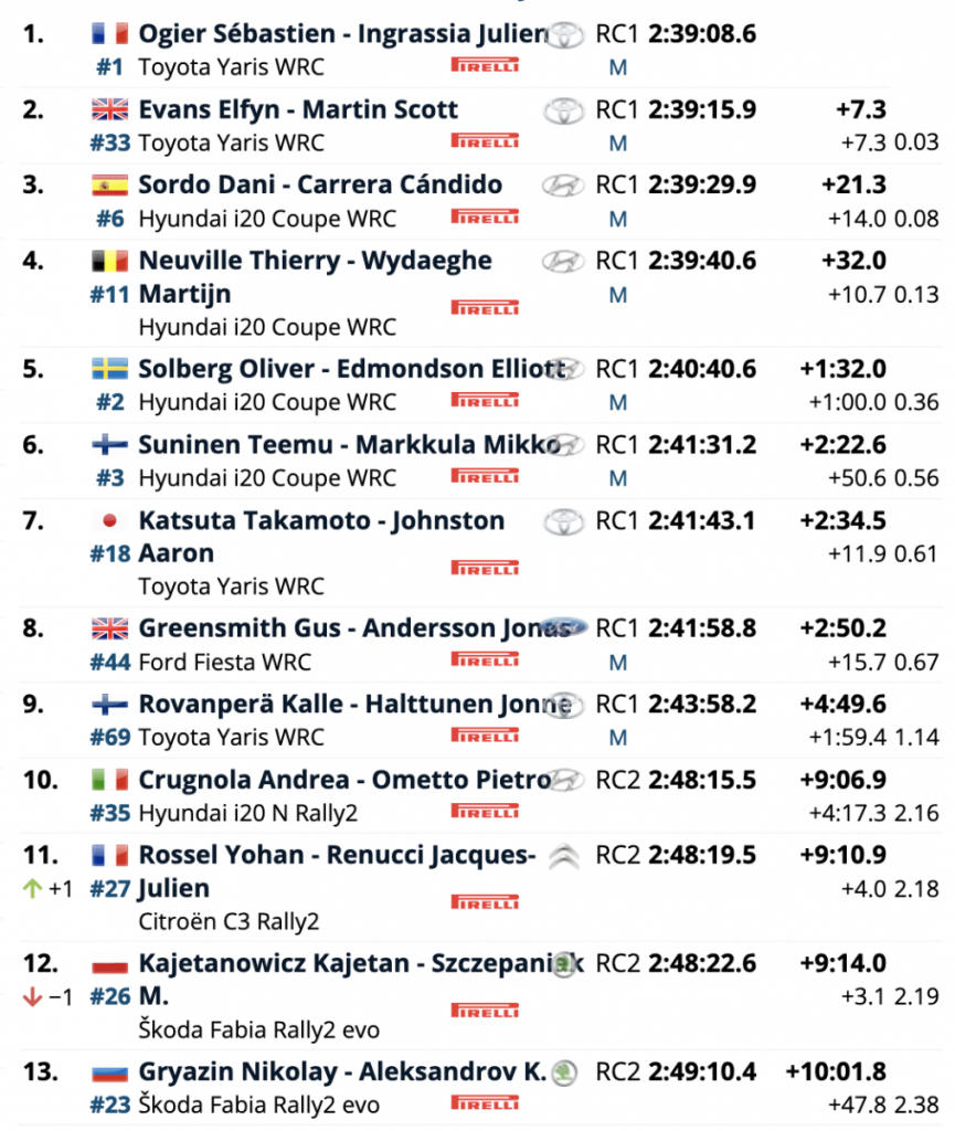 Oliver Solberg consiguió un quinto puesto, el mejor de su carrera, a pesar de que el motor de su i20 se caló dos veces en el último tramo. Teemu Suninen subió a la sexta posición con un coche similar cuando Takamoto Katsuta hizo un trompo contra una barrera y rompió la suspensión delantera izquierda de su Yaris en el penúltimo tramo.
