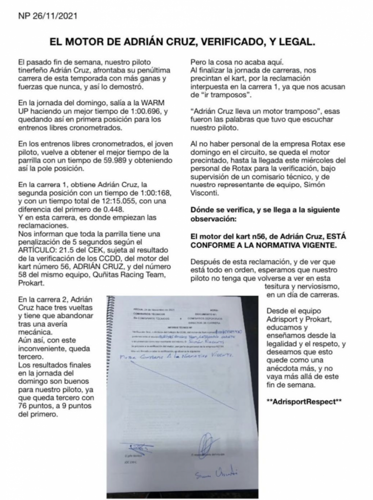 El pasado fin de semana el joven Adrián Cruz saltaba a la primera plana por su precioso gesto al darle su trofeo de tercer clasificado a un compañero al que se había desclasificado, pero tras las carreras el joven deportista tinerfeño conocía que su kart quedaba precintado, pero una vez verificado se ha demostrado que todo está en orden.
