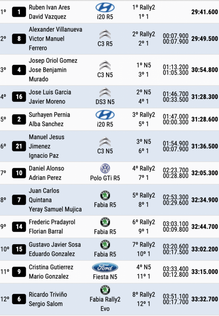 Sextos están Manuel Jesús Jiménez e Ignacio Paz (Citroën C3 N5), seguidos de Daniel Alonso y Adrián Pérez (Volkswagen Polo GTi R5), siendo octavos los canarios Juan Carlos Quintana y Yeray Mujica (Skoda Fabia Rally2), actuales líderes del CERT. Sólo un tercer puesto les podría proclamar campeones de España, pero ahora mismo, después de la disputa de las dos especiales de arranque, está a 1:40.1 del tercer puesto, el ocupado por Oriol Gómez y José Benjamín Murado.