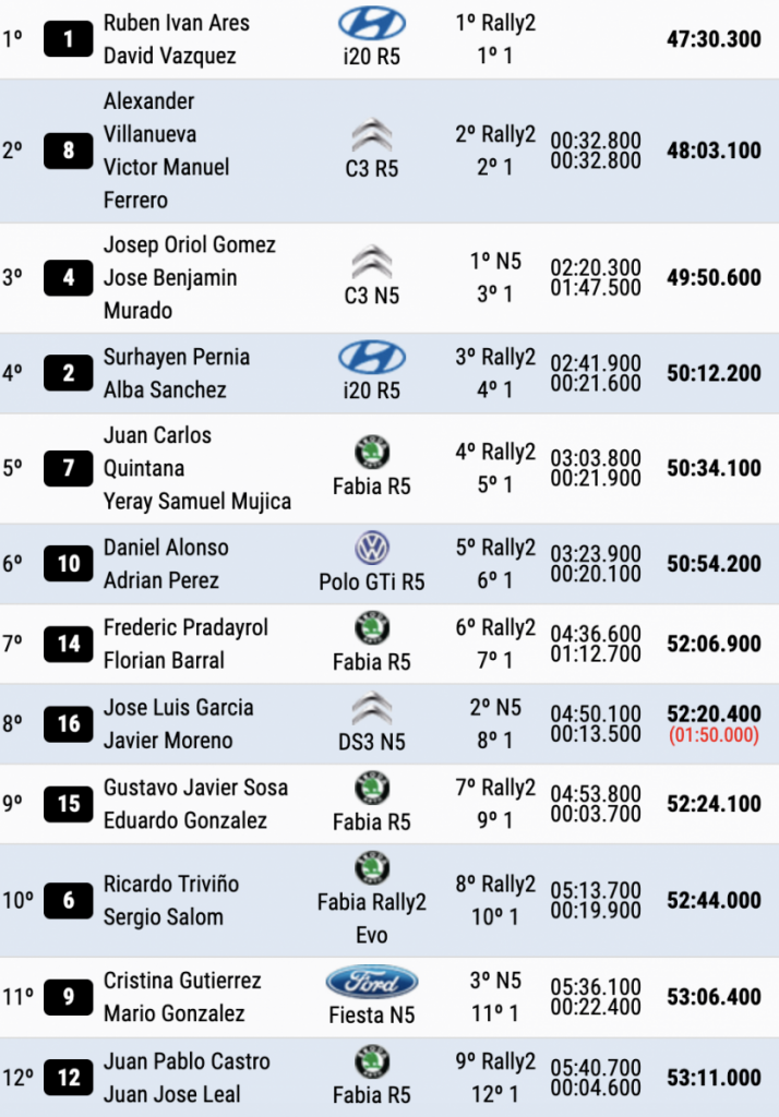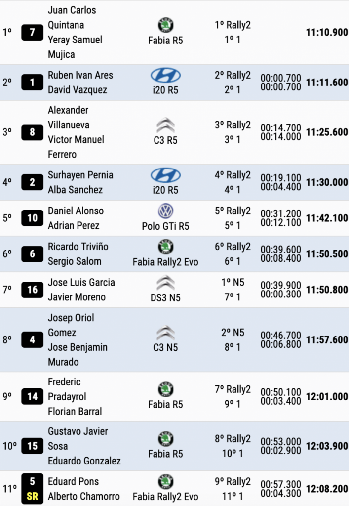 Los isleños han superado en 0.7 a los líderes de la cita leonesa, Iván Ares y David Vázquez (Hyundai i20 Rally2), en 14.7 a los segundos clasificados, en 19.1 a los cuartos, Surhayen Pernía y Alba Sánchez (Hyundai i20 Rally2), en 31.2 a Daniel Alonso y Adrián Pérez (Volkswagen Polo GTi R5), a los que han superado en la general y en 46.7 a los terceros de la general, Oriol Gómez y José Benjamín Murado (Citroën C3 N5).