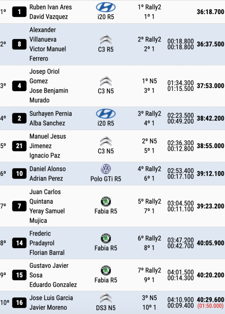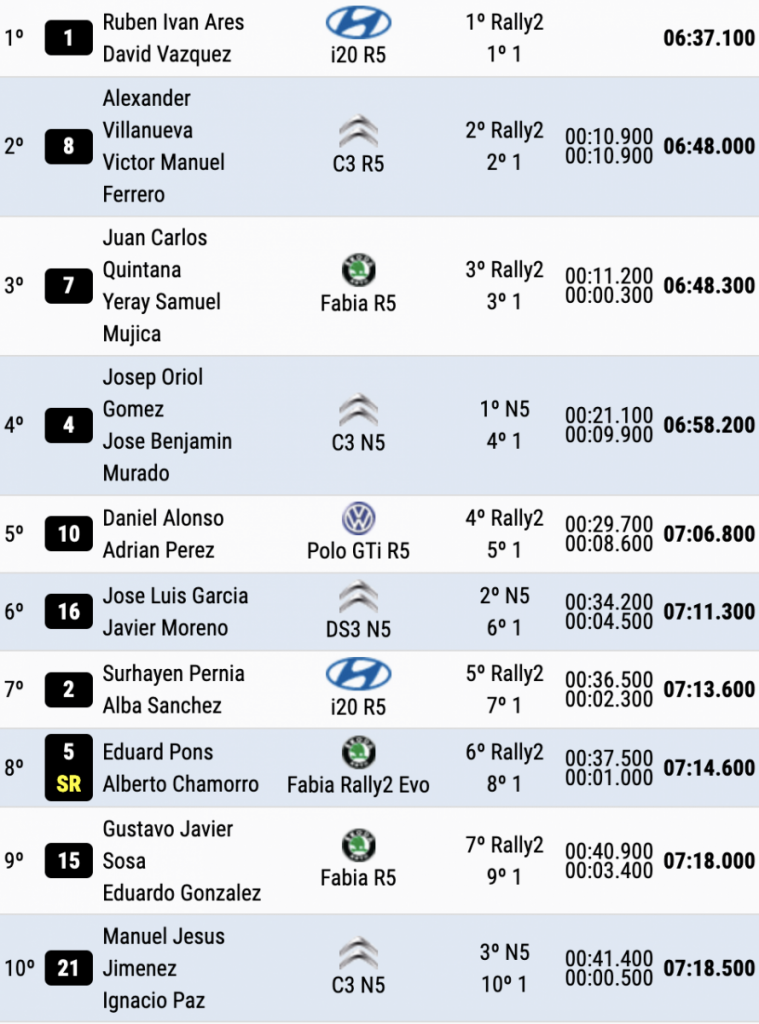 Los grancanarios Juan Carlos Quintana y Yeray Mujica (Skoda Fabia Rally2) han sido los terceros más rápidos de esta cuarta crono, a 11.2 del liderato y recortándole 9.9 a Oriol Gómez y José Benjamín Murado (Citroën C3 N5), terceros de la general y cuartos del tramo.