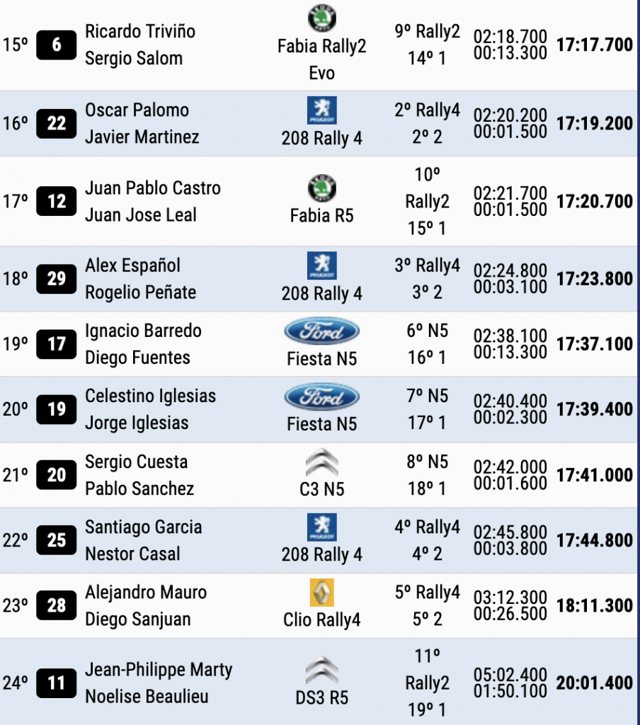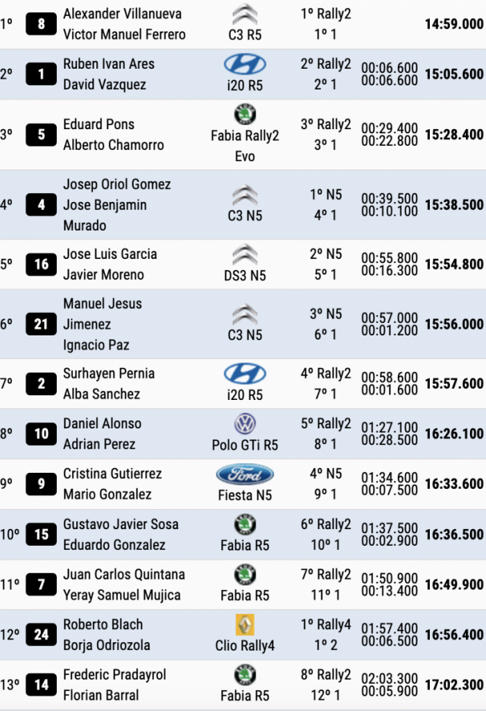 Terceros son Eduard Pons y Alberto Chamorro (Skoda Fabia Rally2) a 29.4, seguidos de Oriol Gomez y José Benjamin Murado (Citroën C3 N5) a 39.5 de la cabeza y a 10.1 del último escalón del podio.