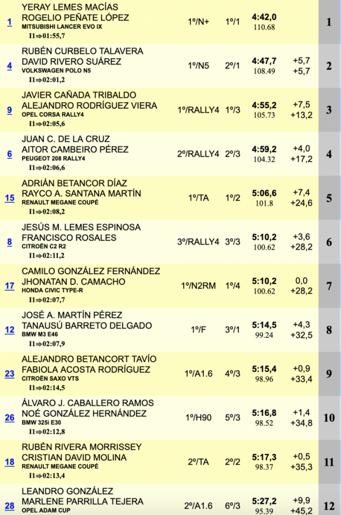 Segundos son ahora Javier Cañada y Alejandro Rodríguez, que en su estreno con el Opel Corsa Rally4 lo están bordando, superando en 5.5 a Juan Carlos de La Cruz y Aitor Cambeiro (Peugeot 208 Rally4), terceros.