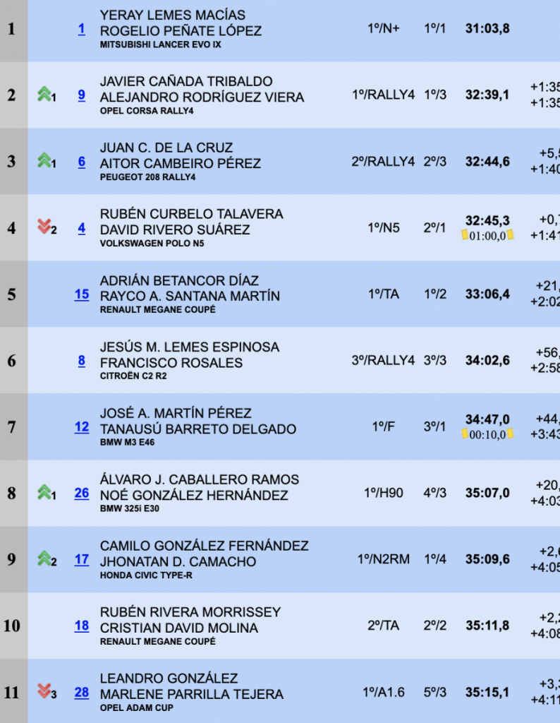 Curbelo y Rivero han bajado a la cuarta plaza a pesar de ser los segundos más rápidos de la cuarta crono, estando a sólo 0.7 del tercer lugar y a 6.3 del segundo. Quedan dos tramos y kilómetros para recuperar la segunda plazan tiene.