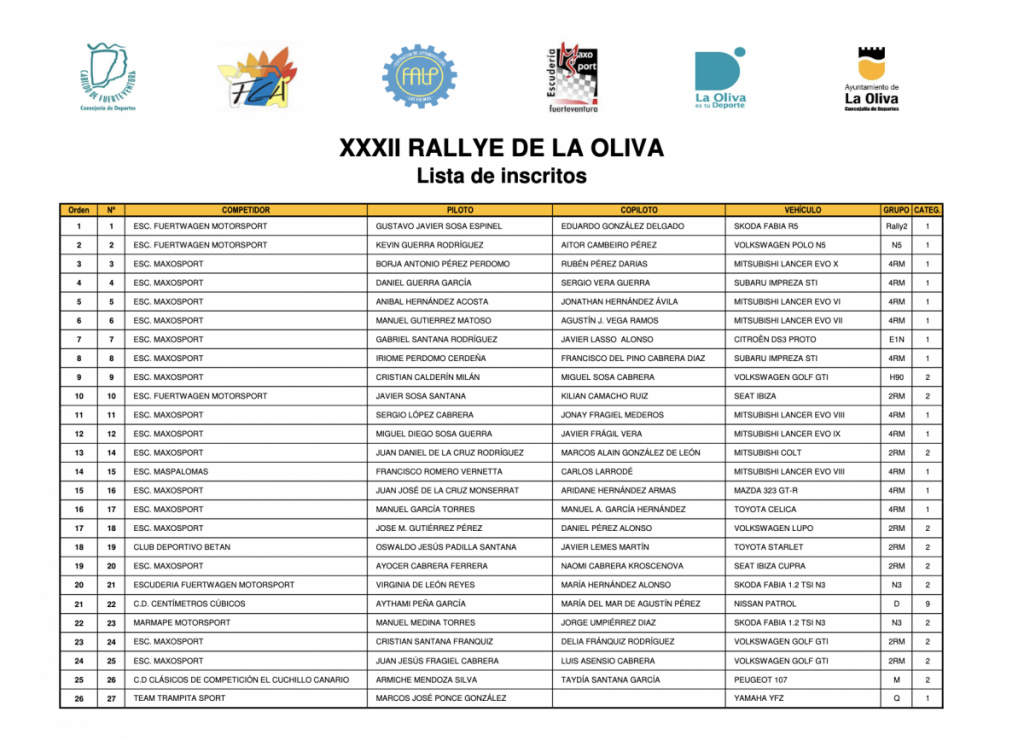 Publicamos la lista de inscritos del XXXII Rallye de La Oliva, prueba que se disputará este sábado en la isla de Fuerteventura.
