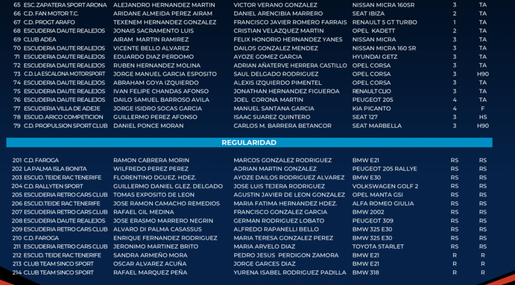 En Regularidad Súper Sport se dan cita un total de 11 equipos, entre los que se encuentran Ramón Cabrera-Marcos González (BMW E21), Wilfredo Pérez-Adrián Martín (Peugeot 205 Rallye), Florentino Domínguez-Ayoze Rodríguez (BMW E30) y Guillermo González-José Luis Tejera (Volkswagen Golf), entre otros. En Regularidad Sport, todos con BMW, se presentan otras tres parejas: Sandra Armeño-Pedro Perdigón, Oscar Álvarez-Jorge Garces y Rafael Márquez-Yurena Rodríguez.