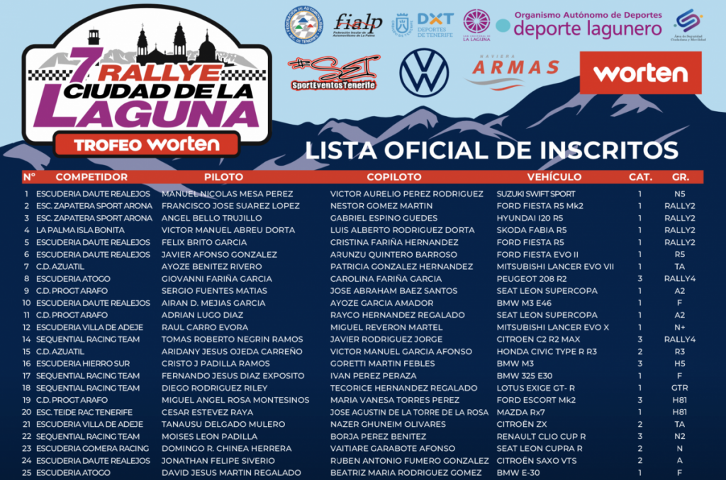 El VII Rallye Ciudad de La Laguna – Trofeo Worten publica su lista oficial de inscritos con 93 equipos que representan a varias islas del archipiélago. Manuel Mesa-Víctor Pérez (Suzuki) encabezan la edición de este año en una cita en la que se darán cita un total de cinco vehículos de la Categoría Rally2.