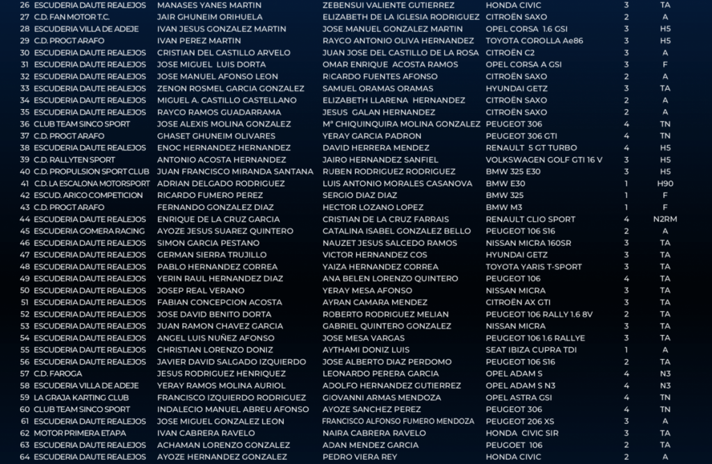 Con todas las papeletas para animar los puestos de cabeza se encuentran Adrián Lugo-Rayco Hernández (SEAT León Supercopa), Raúl Carro-Miguel Reverón (Mitsubishi Lancer Evo X), Roberto Negrín-Javier Rodríguez (Citroën C2 R2 Max), Aridany Ojeda-Víctor García (Honda Civic Type R R3) y Diego Rodríguez-Teco Hernández (Lotus Exige GT-R). Por otro lado, en sus dos grupos, la Copa 1.6 aporta una quincena de vehículos a esta lista de inscritos de casi 100 equipos.